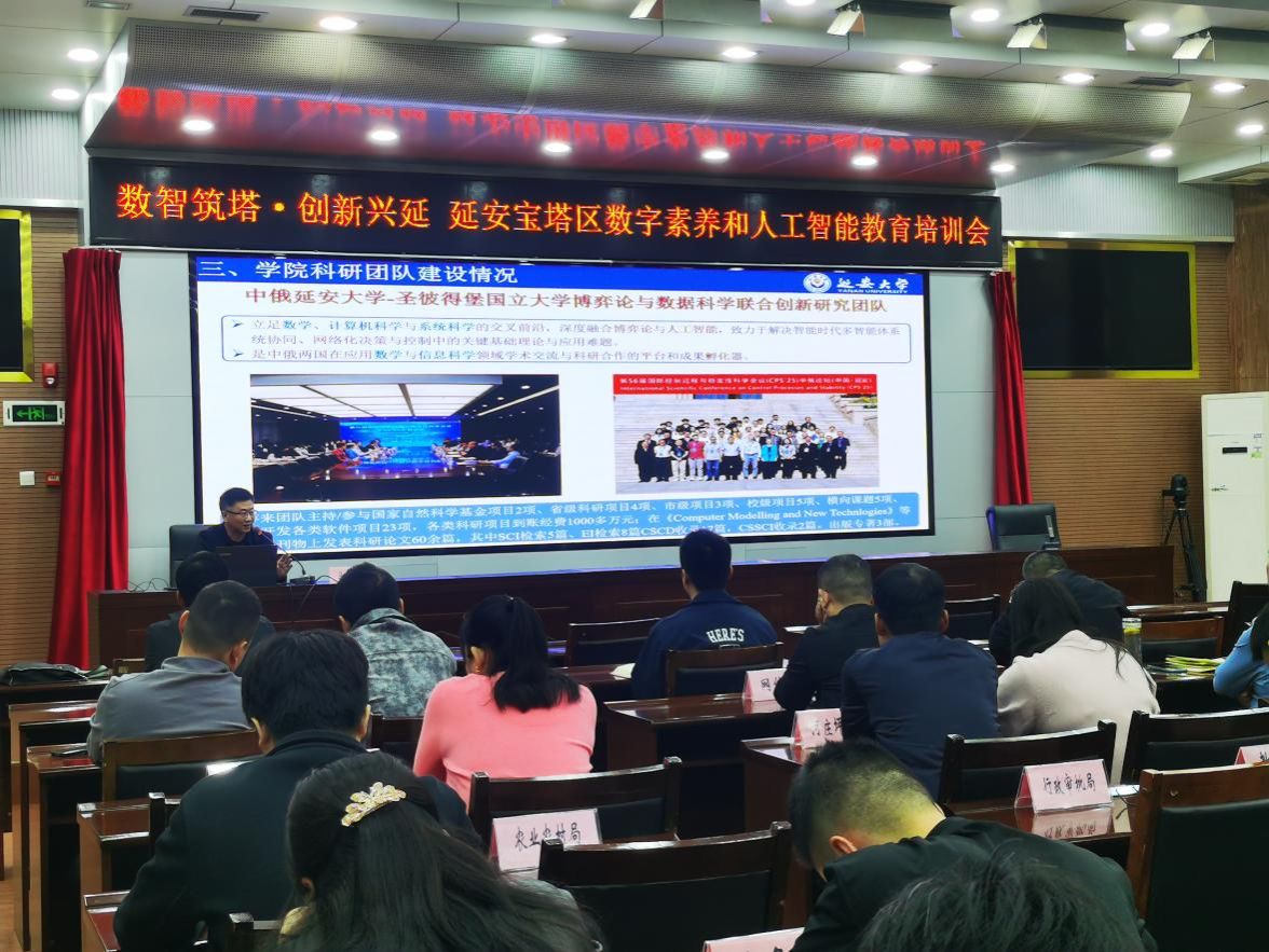 为深入贯彻落实国家创新驱动发展战略,推动校地深度融合,服务延安高质量发展,2026年4月11日上午,数计学院院长马乐荣教授、副院长冯强教授、副院长许淳副教授及科研秘书谢生龙副教授一行四人,应邀赴宝塔区政府主楼八楼报告厅,出席“数智宝塔·创新兴延——延安宝塔区数字素养和人工智能教育培训会”。