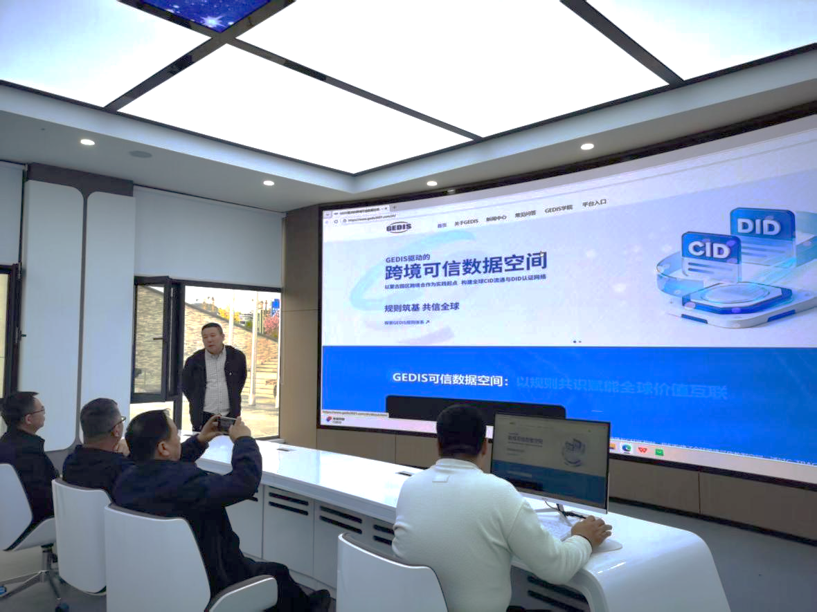 调研团队首先实地参观了延安可信空间与延安市数字贸易跨境服务中心,详细了解了两处平台的建设背景、运营模式、业务布局及未来发展规划。在随后召开的座谈会上,西安华缘集团有限公司经理李栋围绕“GEDIS 华缘汇通系统——从规则制定到价值落地的数字贸易”作专题介绍,系统阐释了平台的核心理念、技术架构与实践成果。他从规则构建、技术支撑到价值落地的全链条视角,分享了数字贸易领域的典型应用案例,重点介绍了 GEDIS 数字基础设施在延安的本地化落地实践,以及面向全球的发展布局与远景目标。双方就数字贸易基础设施建设、数据要素高效流通、跨境服务生态协同构建等议题展开深入交流与探讨。
